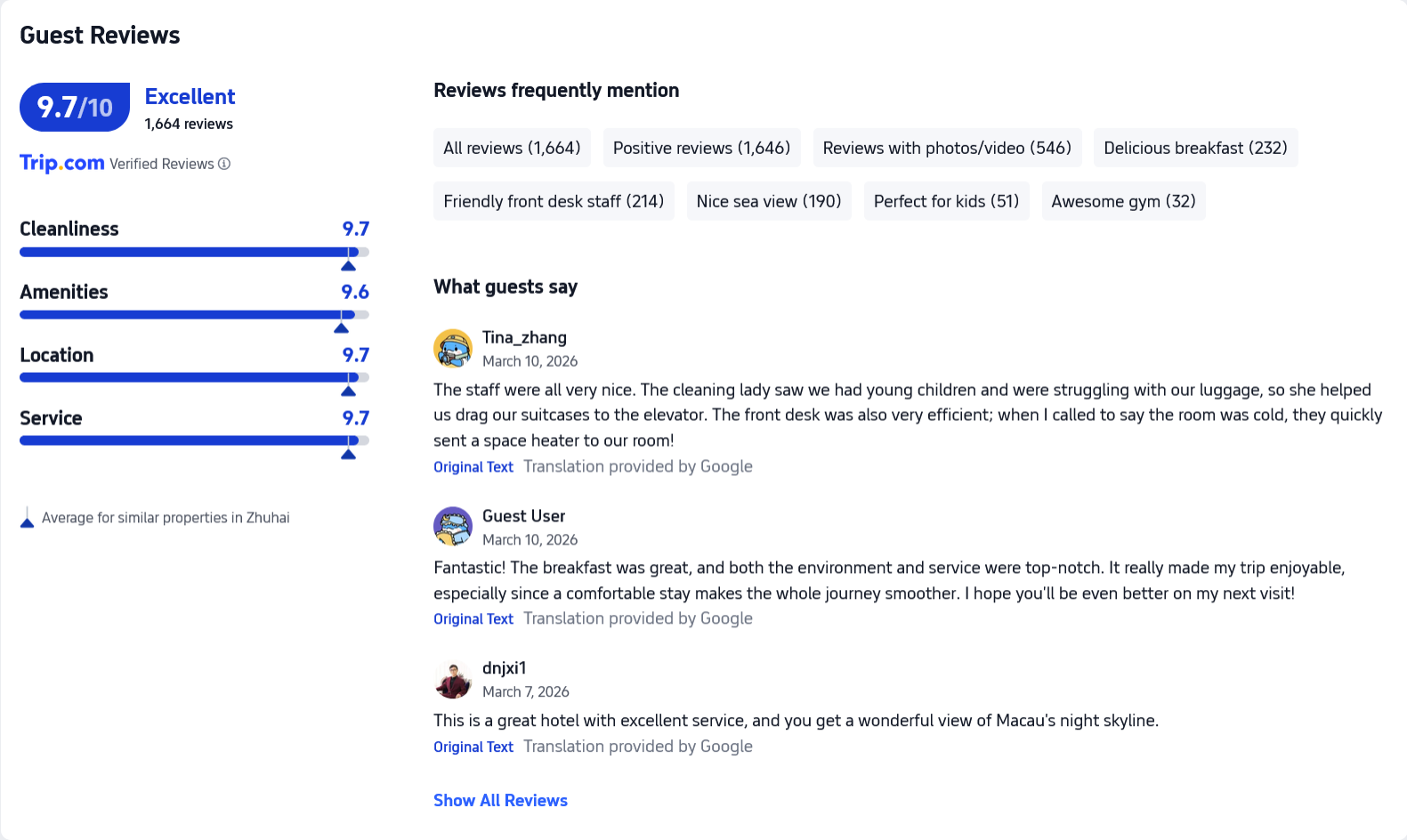 珠海橫琴海景城際酒店坐落於橫琴金融島港澳金融中心的核心地段,是一家於2025年全新開幕的飯店,可飽覽澳門及地標性建築澳門塔的壯麗全景。這間潔淨如新的飯店距離橫琴港僅幾步之遙,步行3分鐘即可抵達華發購物中心。飯店的每個角落都擁有令人嘆為觀止的海景,是商務和休閒旅客尋求現代舒適體驗和壯麗景色的理想之選。.